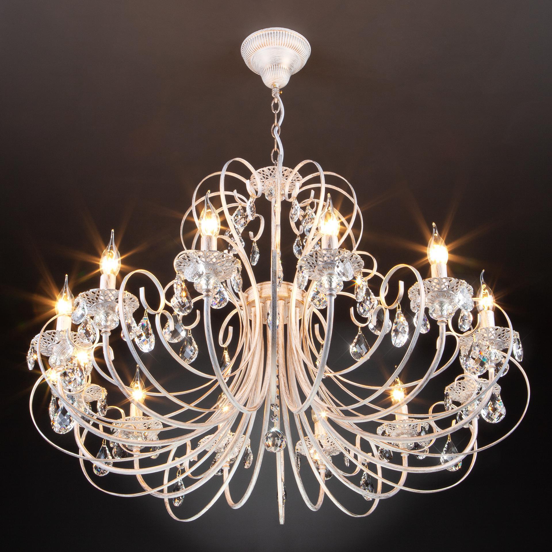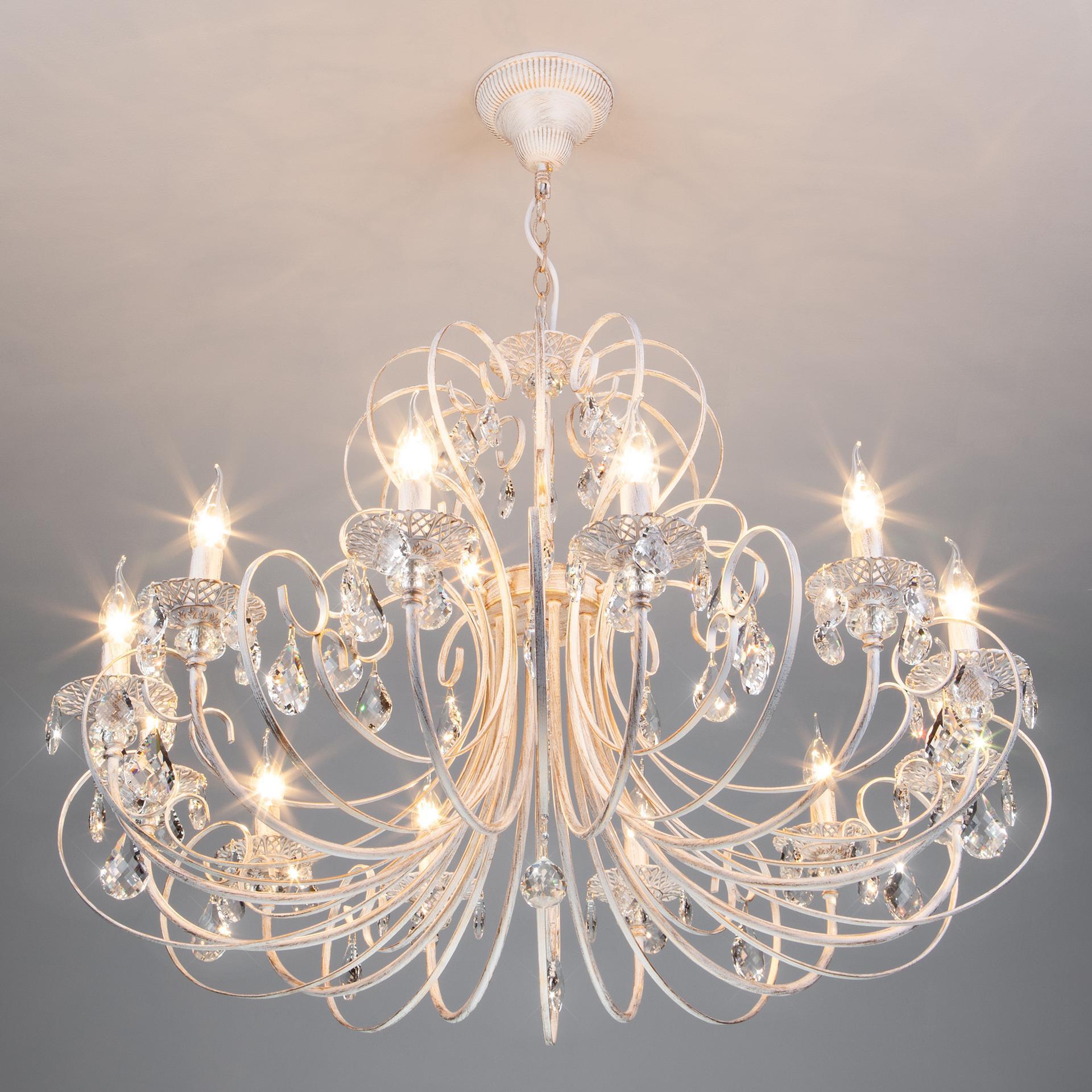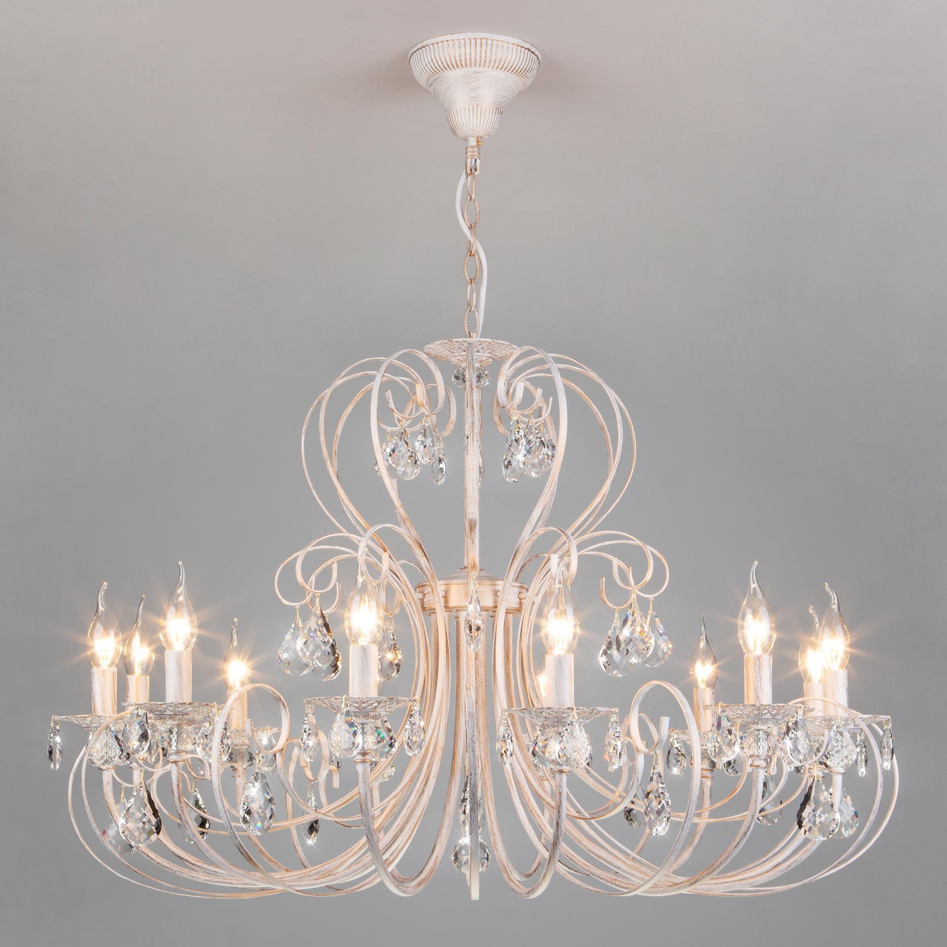 Классическая хрустальная люстра на 12 рожков в цвете белый с золотом / тонированный хрусталь преобразит потолочное пространство и создаст в вашем помещении комфортное полноценное освещение на площади 48 м кв. Изящные формы и классический стиль добавят вашей гостиной утонченного аристократизма. Декоративные рожки в виде подсвечников, украшенные сменными лампами с цоколем E14 типа свеча на ветру переливаются на свету яркими завораживающими бликами. В производстве подвесной люстры использовали особое стекло с эффектной огранкой и высококачественный металл с надежным защитным покрытием. В нашем интернет-магазине вы можете купить подвесную хрустальную люстру по выгодной цене с доставкой по Москве и России.