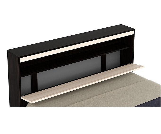 Изголовье кровати представляет собой откидной блок с дополнительной секцией для хранения постельных принадлежностей (подушек, одеял и постельного белья). Очень практичное решение, особенно в том случае, когда количество жилого пространства ограничено. Кровать не только украшает интерьер, но и делает спальное место поистине комфортным и функциональным. По бокам кровати две высокие приставные тумбы. Сверху тумб – горизонтальная полка, которая делит пространство пополам и позволяет разместить негабаритные предметы интерьере – семейные фотографии, свечи, книги, интерьерные часы. Внизу тумбы распашная дверца – еще одно полезное пространство для хранения.