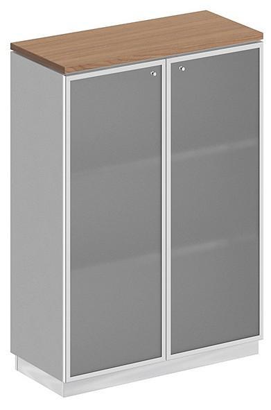 Тумба состоит из стеллажа, топа, цоколя и стеклянных дверей в алюминиевой рамке.