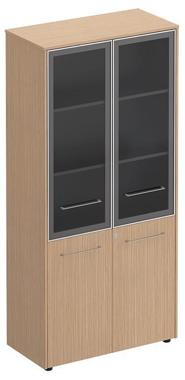 Шкаф укомплектован двумя стеклянными дверями в металлической рамке без замка и двумя дверями из ЛДСП с замком на правой двери.