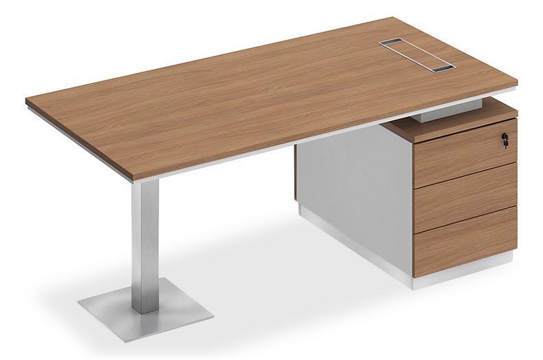 Стол состоит из столешницы, заглушки кабель-канала, металлической опоры и опорной тумбы.