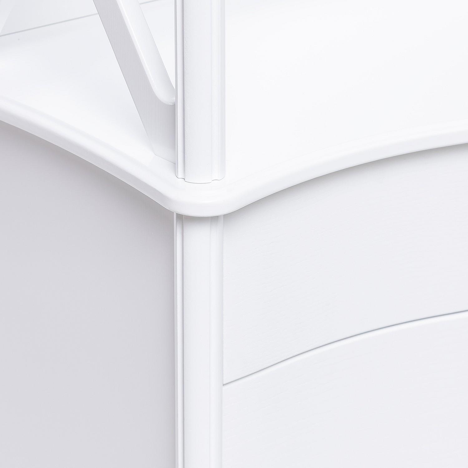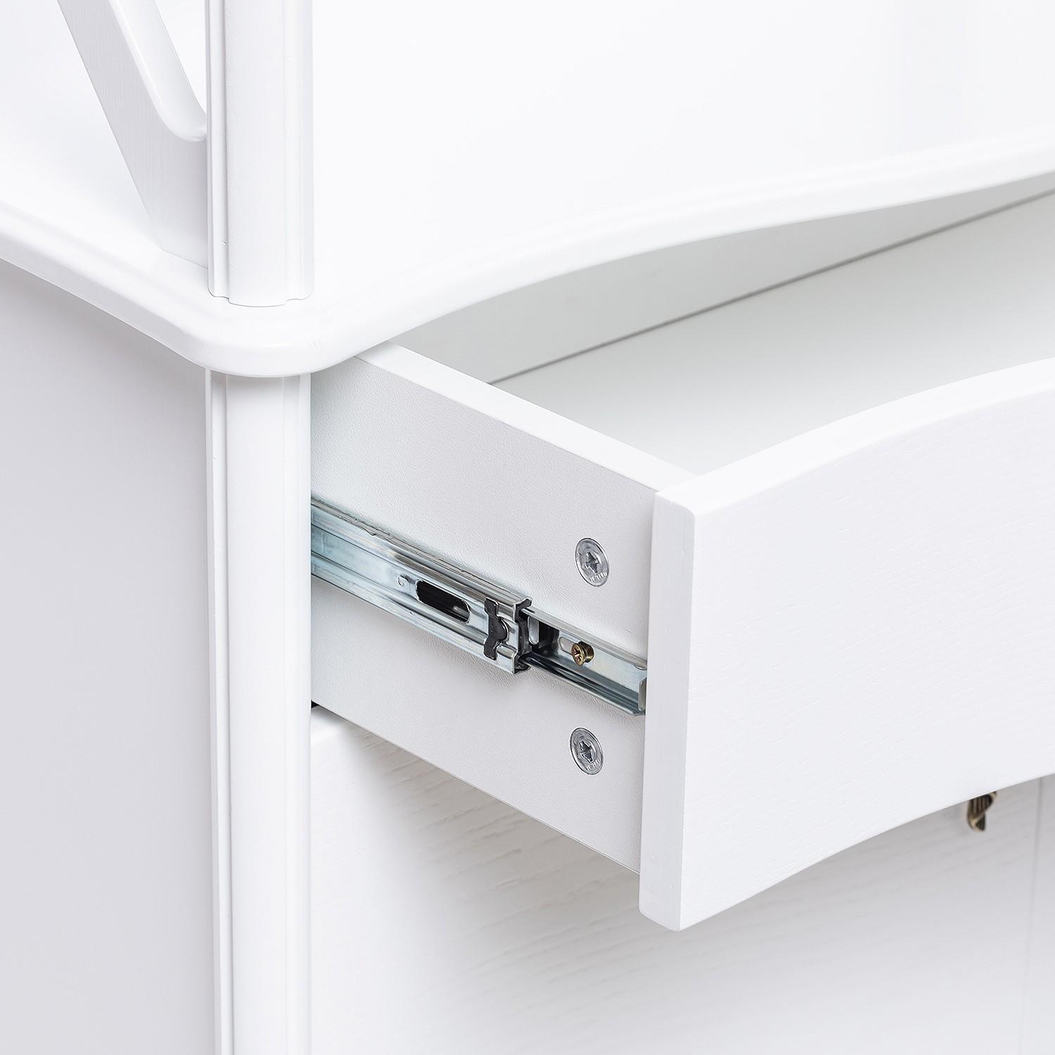 Ярусная конструкция включает 3 полки, выдвижной ящик и тумбу. Вместительные полки, выдерживающие нагрузку до 15 кг, предназначены для хранения посуды, элементов декора и личных вещей.