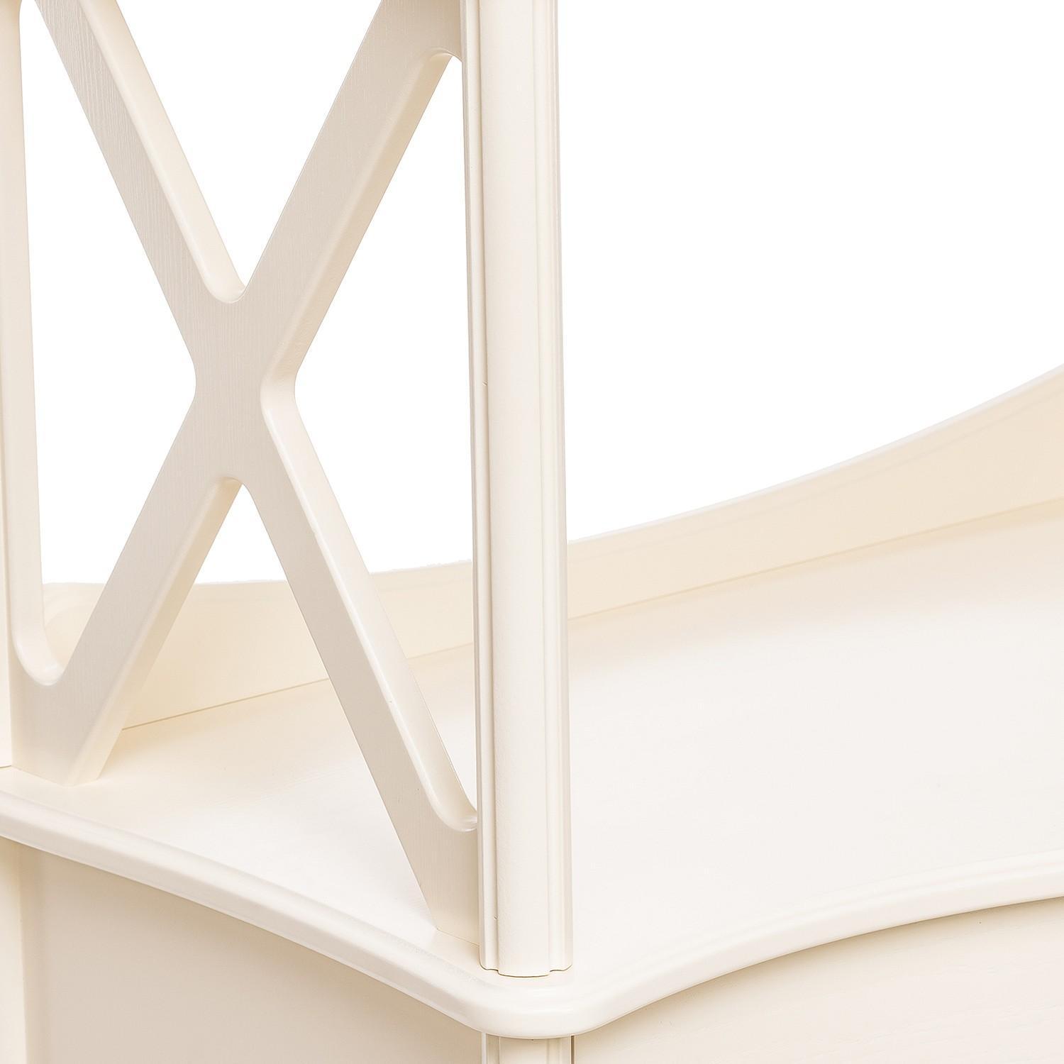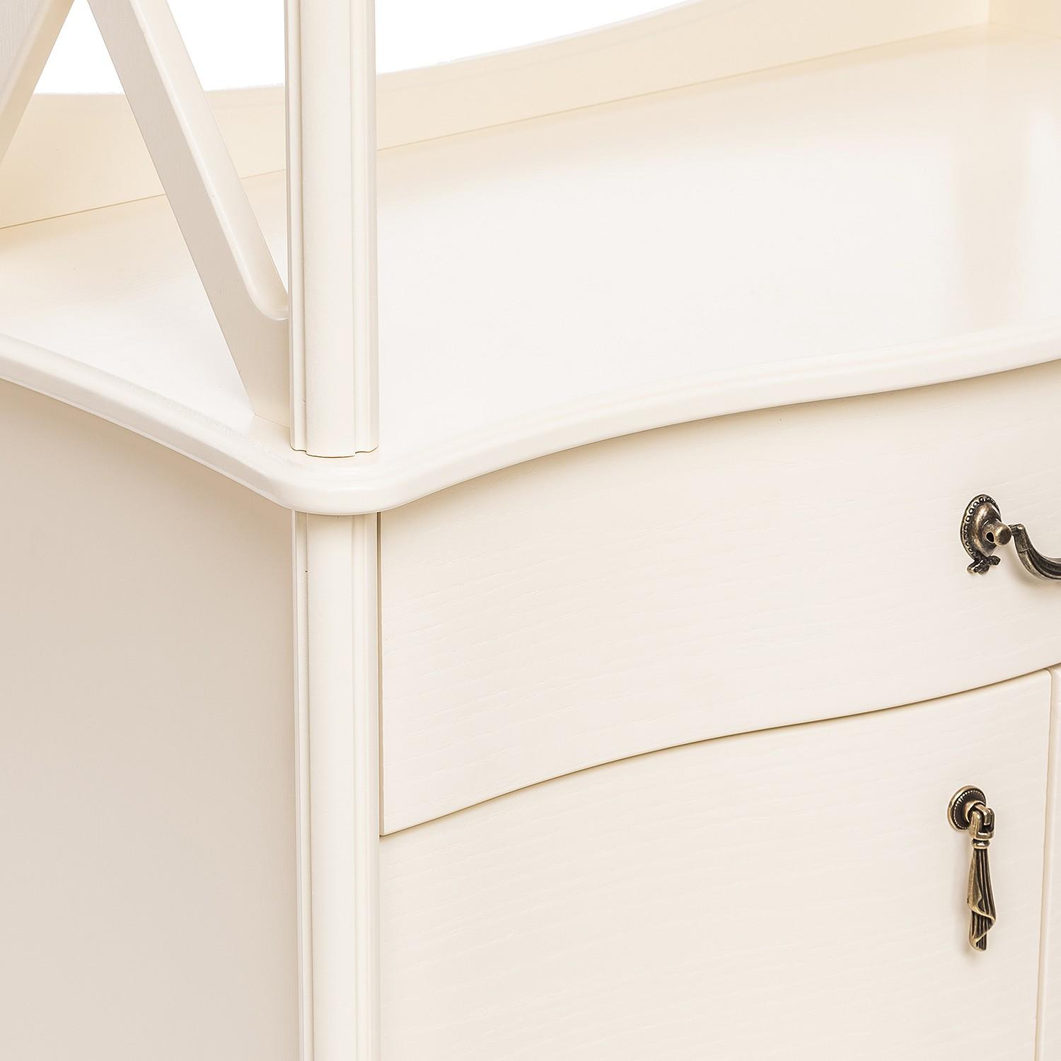 Ярусная конструкция включает 3 полки, выдвижной ящик и тумбу. Вместительные полки, выдерживающие нагрузку до 15 кг, предназначены для хранения посуды, элементов декора и личных вещей.