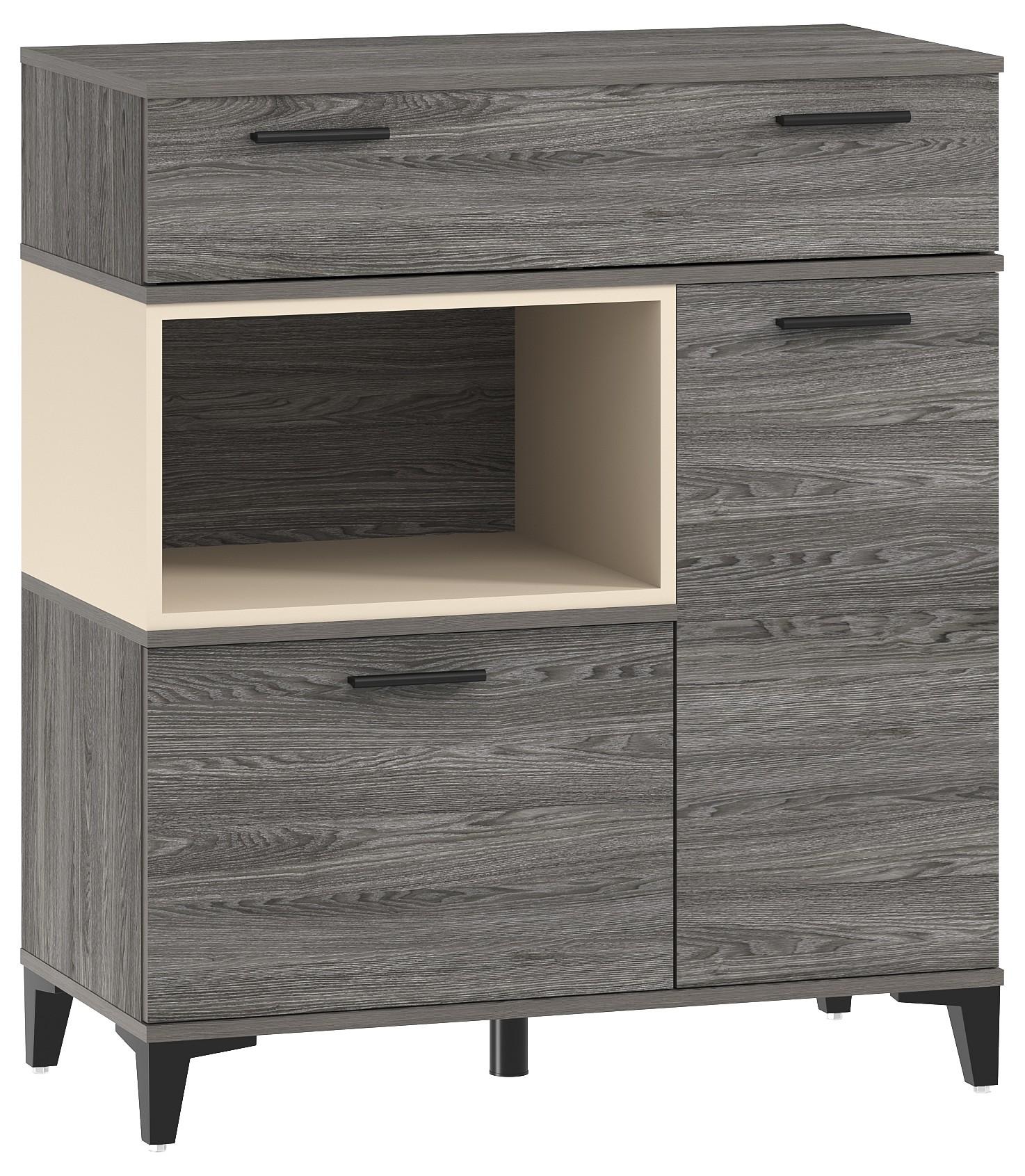 Тумба с выдвижным ящиком на шариковых направляющих, с двумя распашными дверцами и открытой полкой.