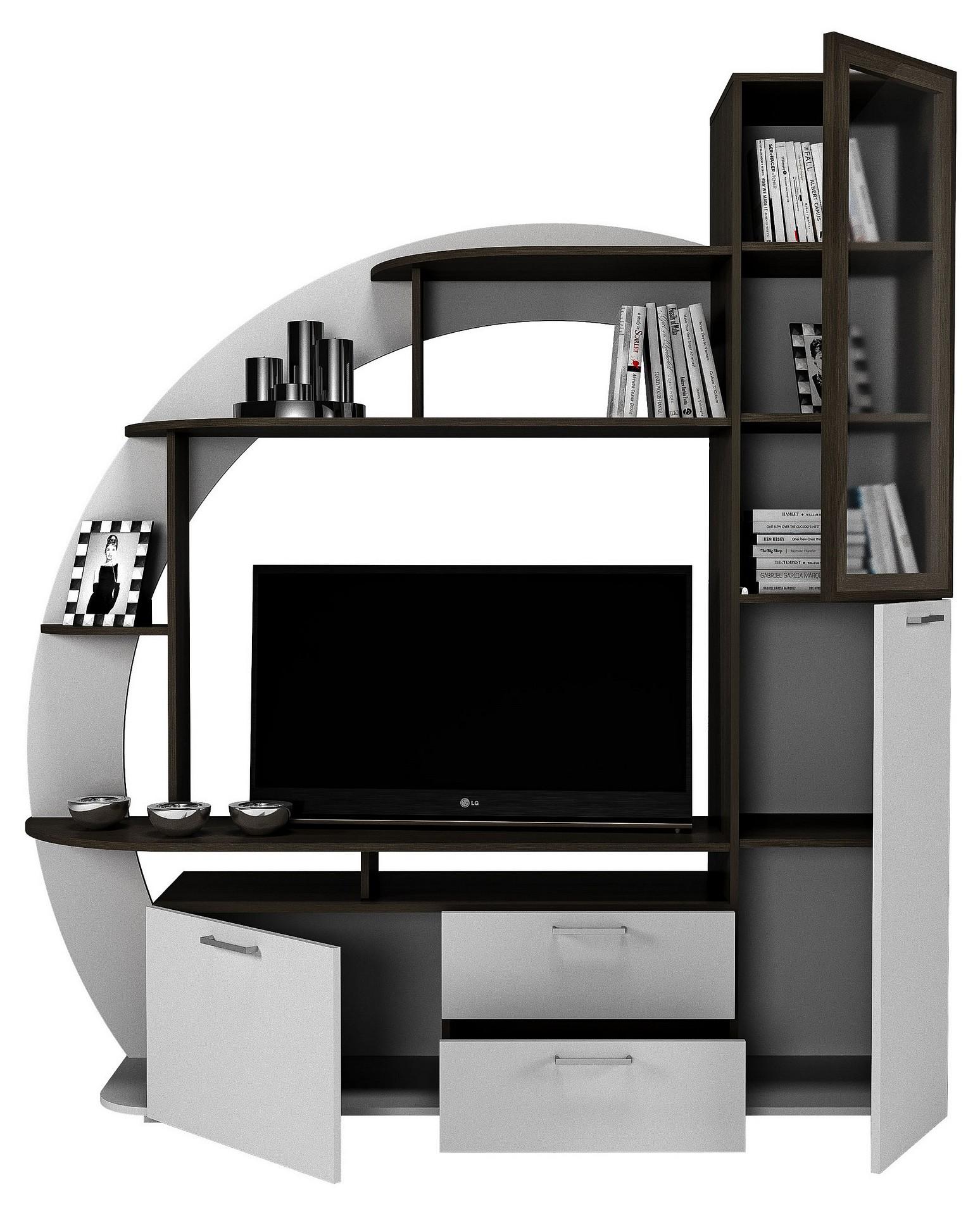Тумба под ТВ с двумя выдвижными ящиками на шариковых направляющих, с тремя распашными дверцами и открытыми полками.