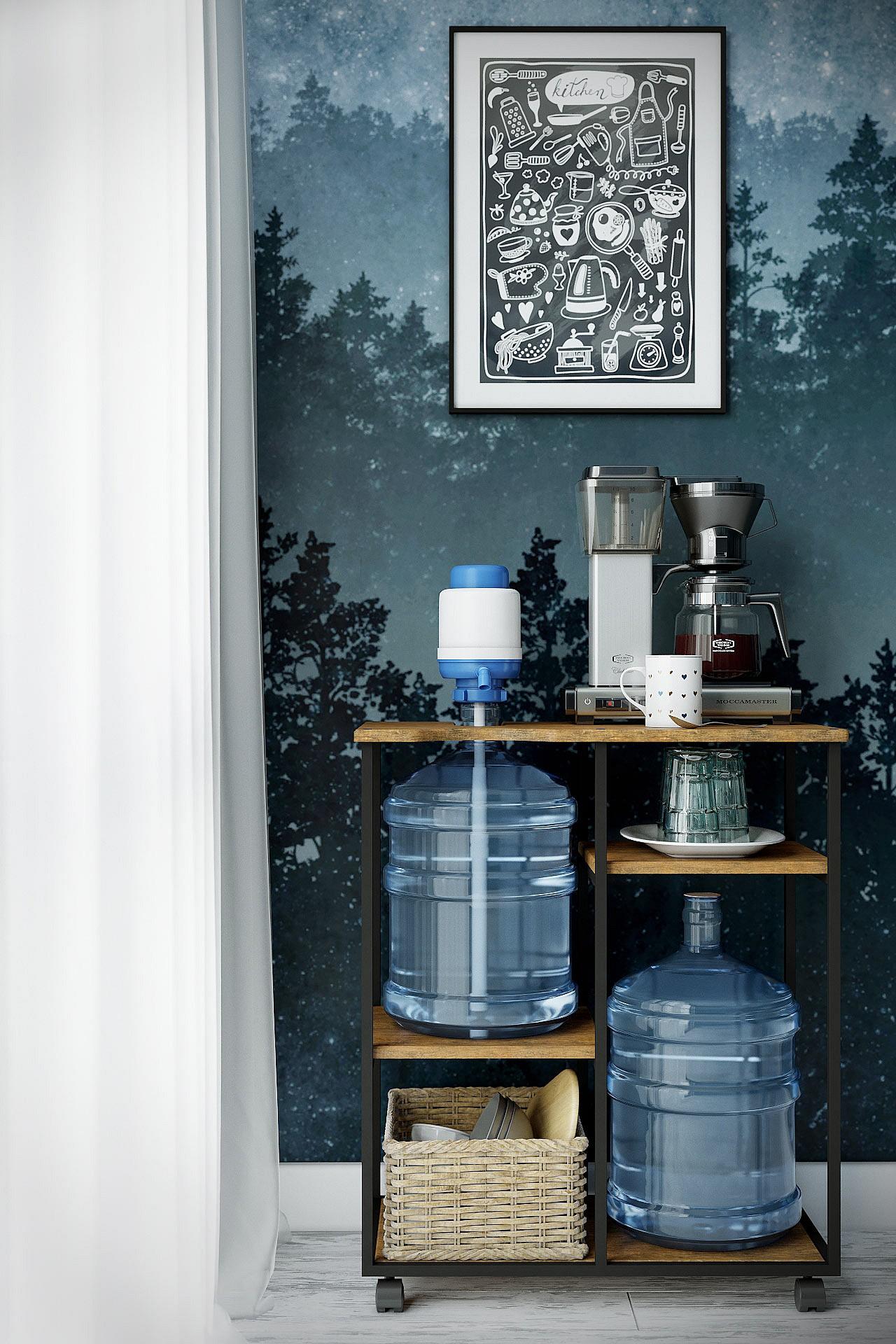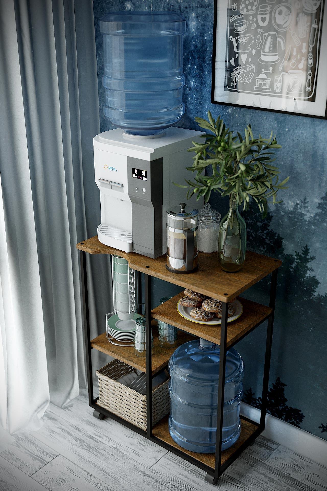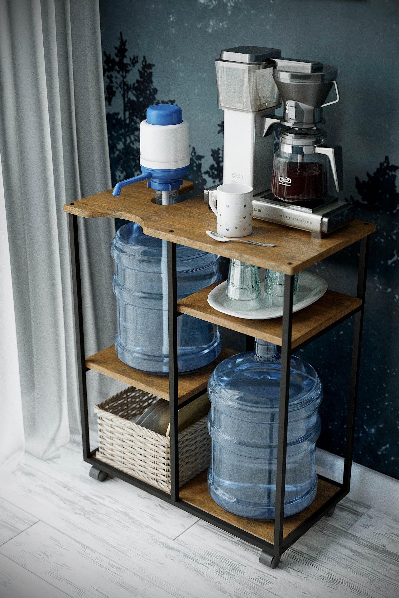 Подставка для воды УОТЕР LOFT, выполненная в стиле лофт, безусловно подчеркнет стилистику помещения. Сборно-разборный каркас подставки изготовлен из профильной трубы 15x15 мм, полки выполнены их экологичного материала МДФ. Подставку можно использовать и для кулера, и для бутыли, и сочетать бутыль с кулером и дополнительной бутылью. Основание подставки на роликовых опорах. Цветовая гамма подставки дополняет основную стилистику: влагостойкое декоративное покрытие, стилизованное под камень и дерево, безусловно придаст оригинальности и эстетики интерьеру.