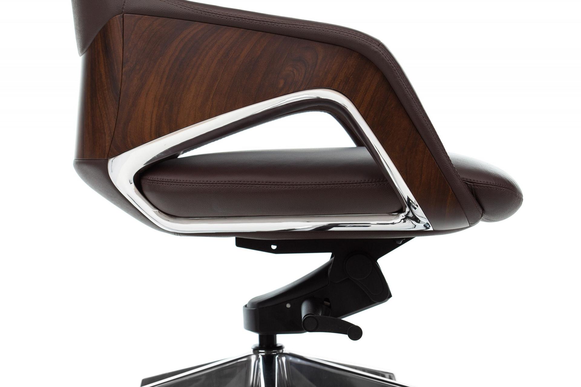Механизм со смещенной осью качания с возможностью фиксации в нескольких положениях. Регулировка высоты (газлифт). Подлокотники монолитные кожаные с пластиковыми вставками под дерево. Крестовина алюминиевая. Колеса для паркета и ламината. Материал обивки: натуральная кожа (лицевые части).