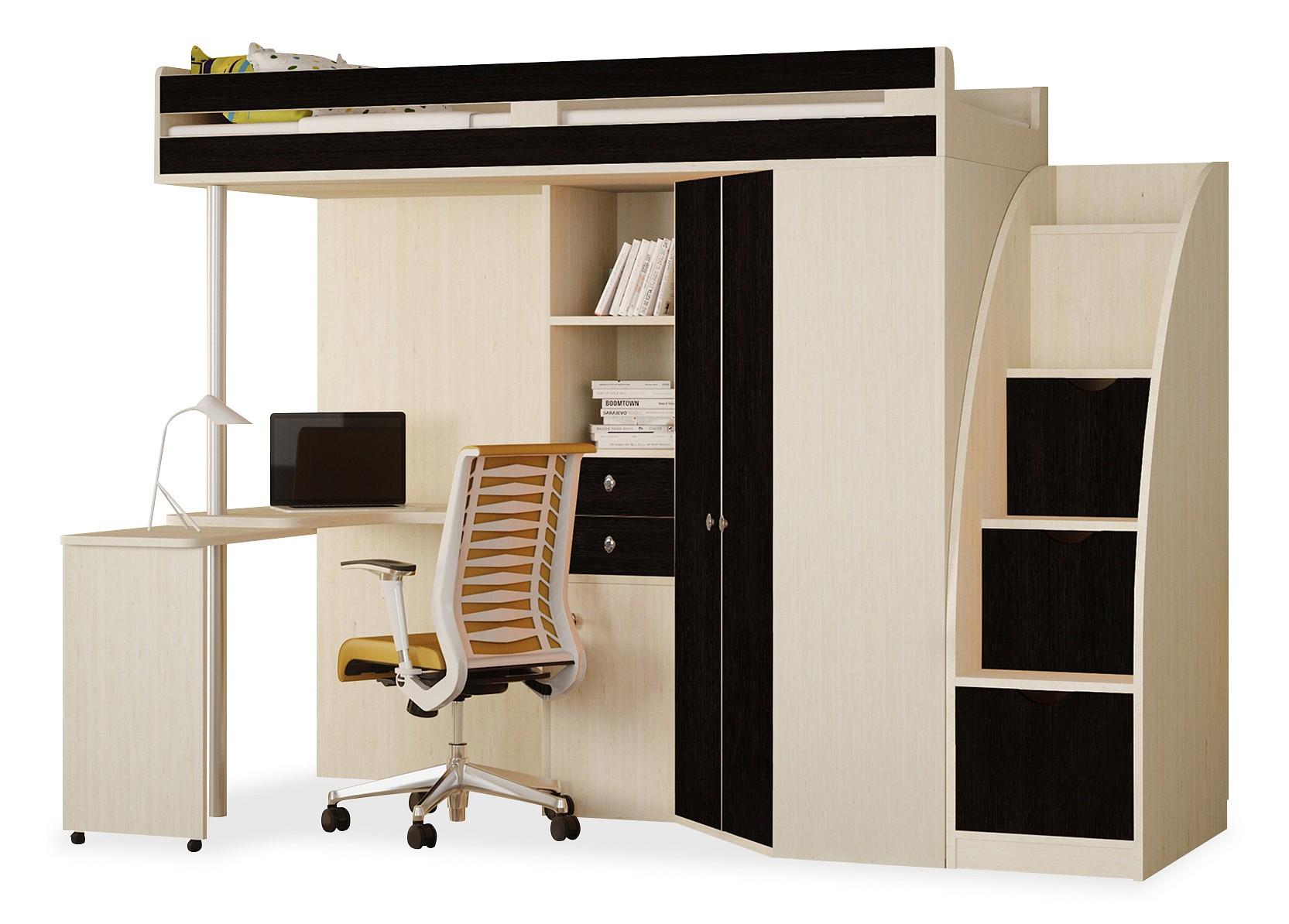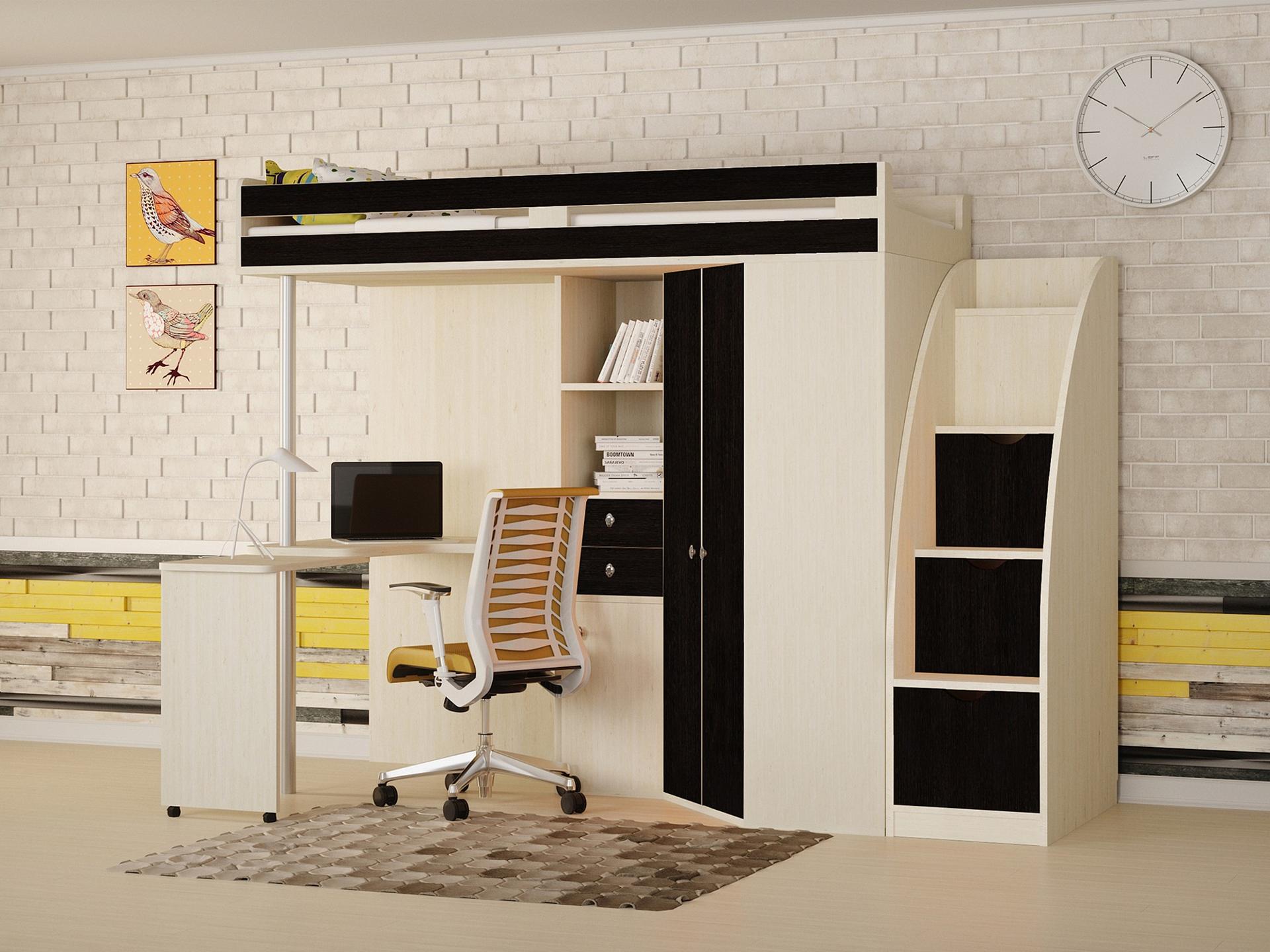 Стоит еще отметить лестницу, по которой можно подняться наверх. Ее конструкция имеет широкие деревянные ступени, металлический каркас и закреплена она под углом относительно кровати, что делает ее более удобной и эргономичной.