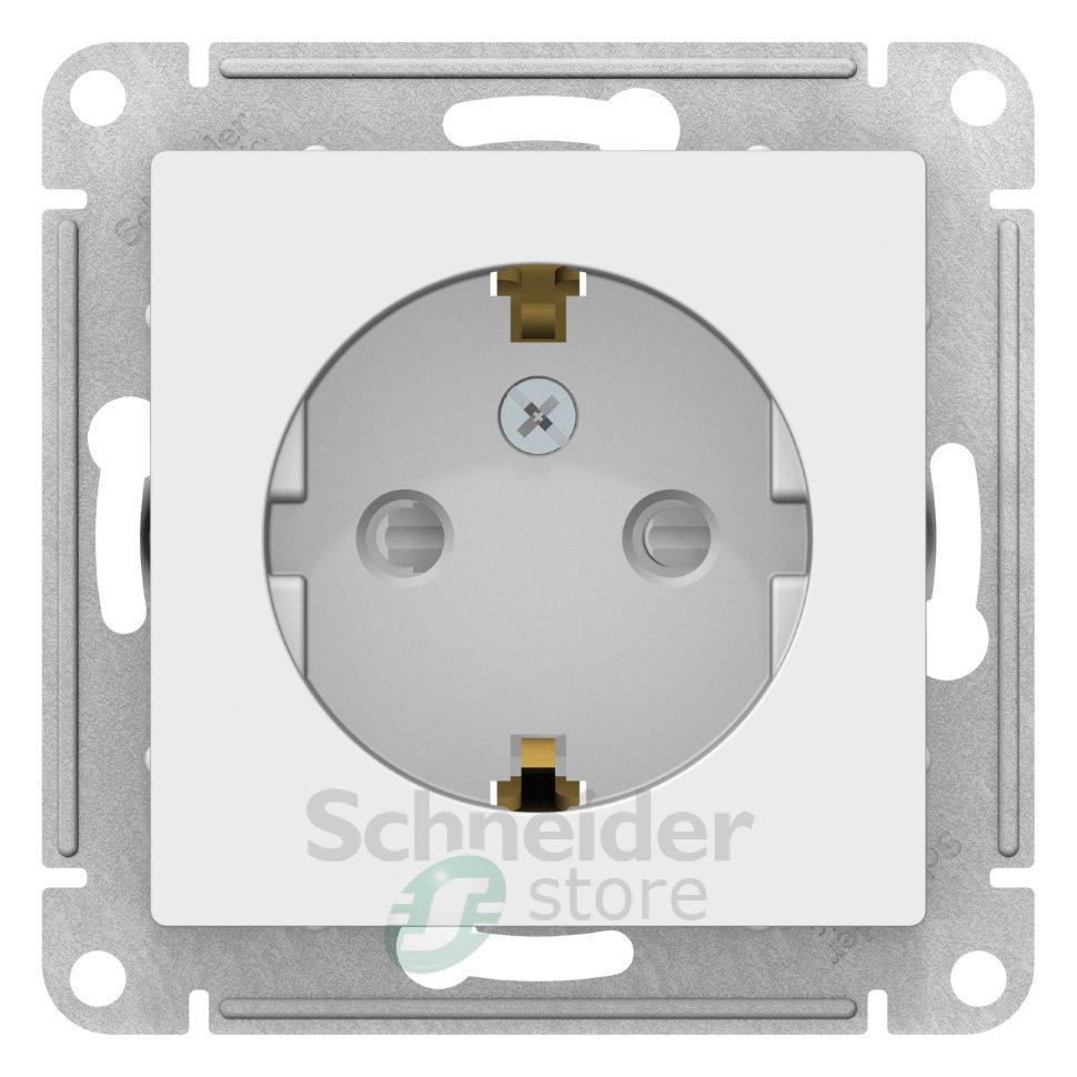 Механизм Schneider Electric AtlasDesign (цвет белый) розетки одинарной с заземлением и шторками подходит для сетей 250 В, на ток 16 А.