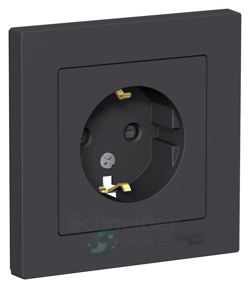 Розетка Schneider Electric AtlasDesign (в сборе, цвет карбон) одинарная с заземлением и без шторок подходит для сетей 250 В, на ток 16 А.