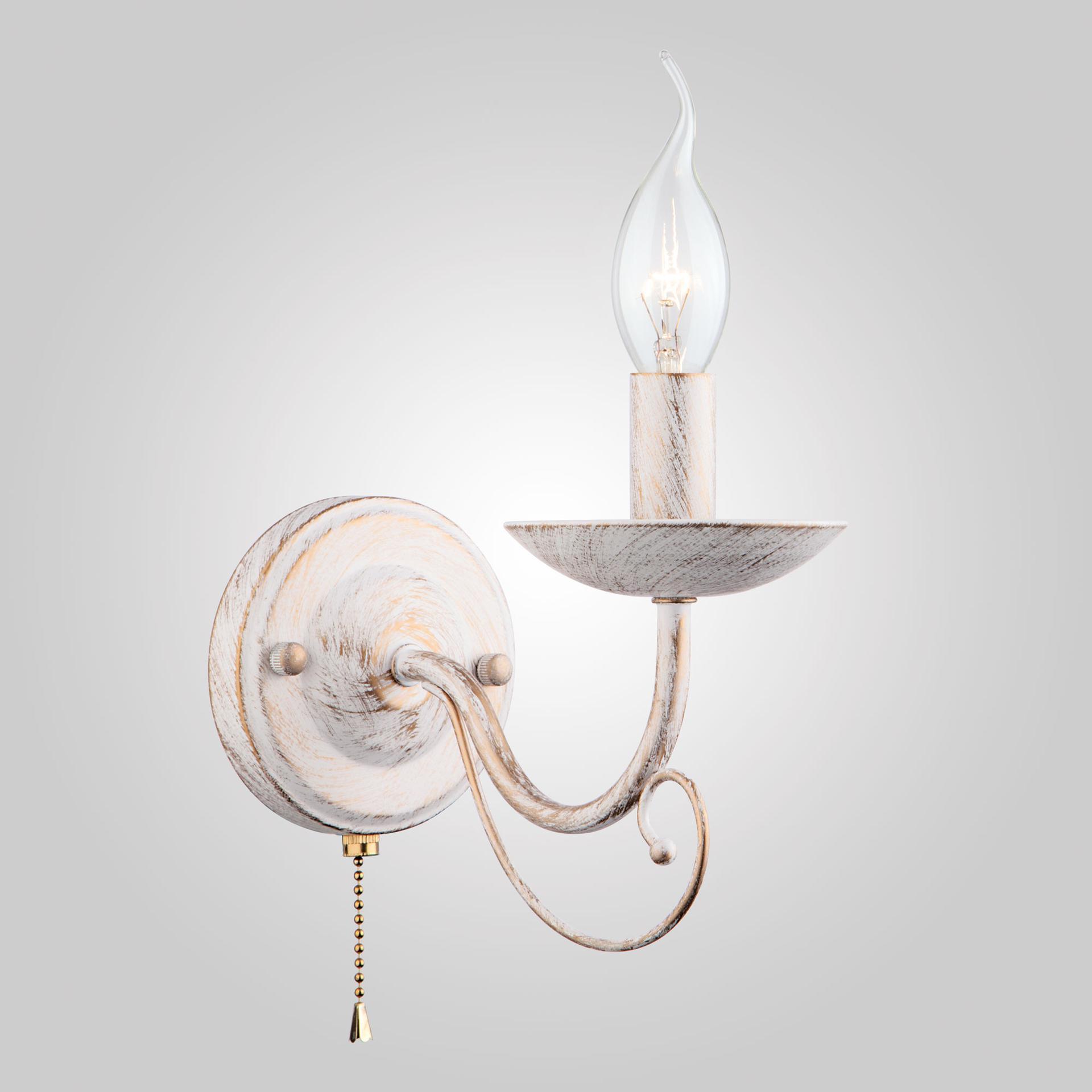 Настенный светильник в классическом стиле 22404/1 белый с золотом создаст качественное дополнительное освещение и станет эффектным дополнением к основному источнику света. Бра создает мягкое рассеянное свечение, подходящее для комфортного чтения книг в вечернее время. В качестве источника света используются сменные лампы типа "Свеча на ветру" с цоколем E14. Патрон рассчитан на максимальную мощность ламп накаливания 40 Вт. Корпус светильника выполнен из высококачественного и прочного металла с надежным покрытием. Бра легко устанавливается при помощи крепежной планки, которая обеспечивает надежную фиксацию светильника на стене. В интернет-магазине Минимир вы можете купить настенный светильник с доставкой по Москве, Санкт-Петербургу и России.