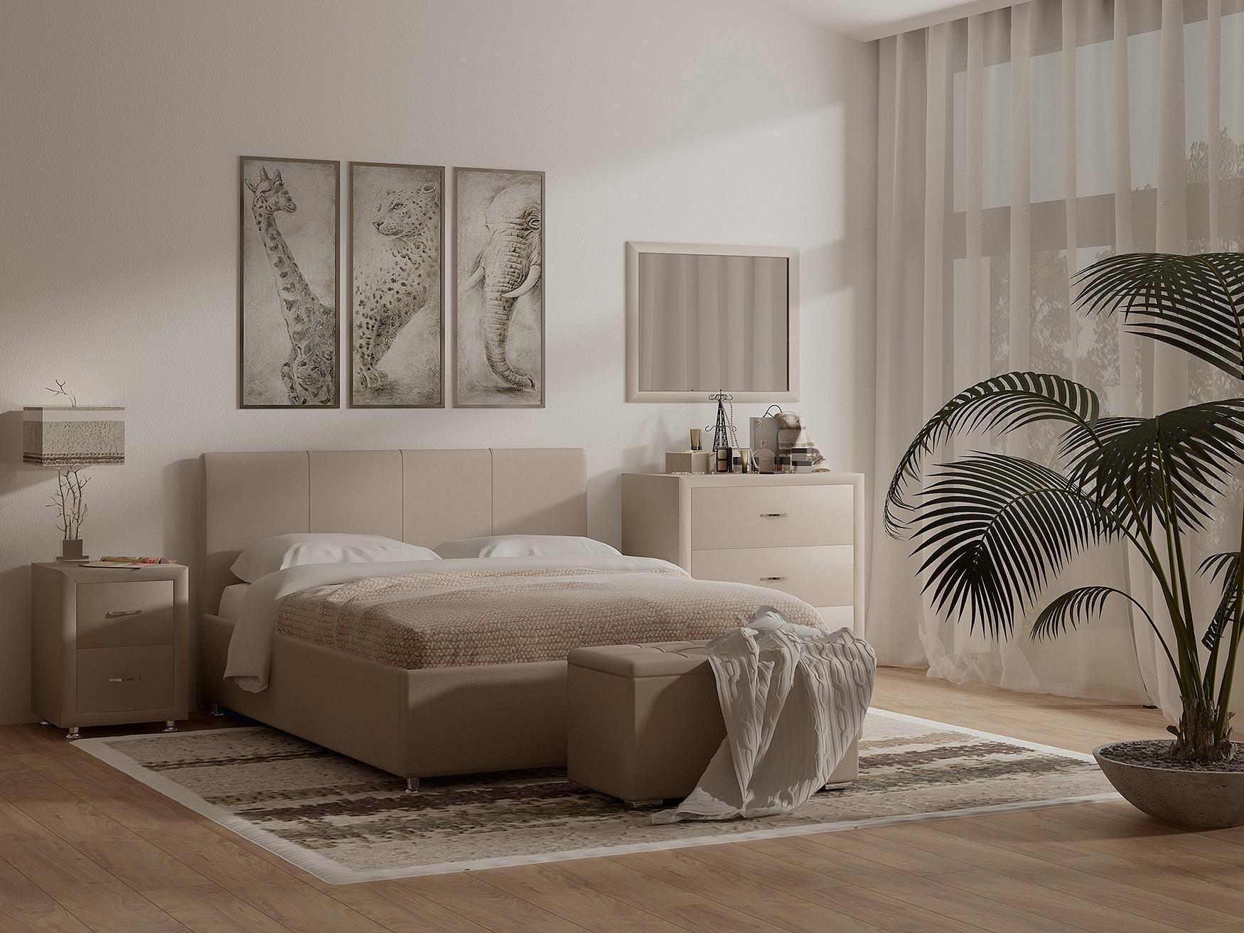 Элегантная интерьерная кровать с изголовьем украшенным декоративной вертикальной строчкой. В комплект кровати входит кроватное основание. Каркас основания выполнен из металла, ламели - из берёзы.