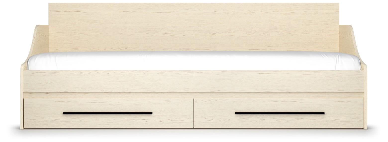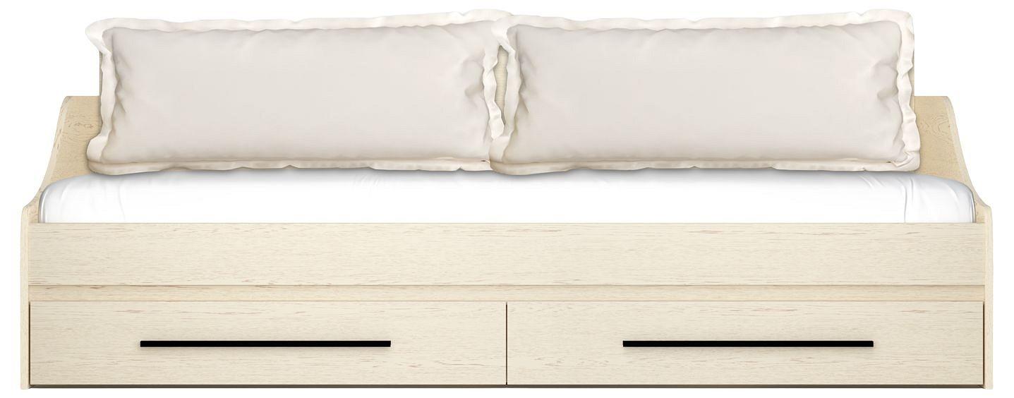 В основании кровати прочный щит ЛДСП. Вместительные ящики выдвигаются ящики при помощи надежных колес.