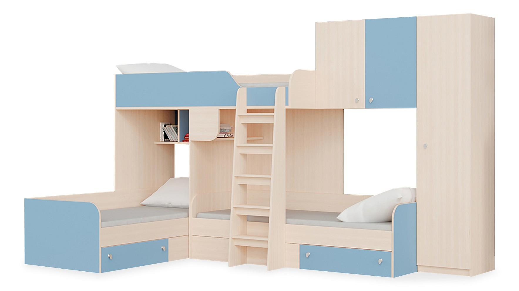 Ваш ребенок вырос и пришла пора обновить мебель в детской комнате? Набор для детской Трио/2 RVM_TRIO-V2-1-6 – отличное решение, которое придется по вкусу не только вам, но и будущему маленькому хозяину или хозяйке. Изделие выпущено известным брендом РВ-Мебель (Россия) и относится к серии «Трио/2». Благородный матовый корпус оттенка голубой, дуб молочный смотрится изысканно и изящно, гармонично дополняя фасад, изготовленный из практичного и востребованного для детской материала (ЛДСП Е1). Перед покупкой новой кровати советуем тщательно замерить свободную площадь в комнате, чтобы кровать точно подошла по габаритам (2000 мм в высоту, 3265 мм в ширину и (уточните актуальную информацию у нашего консультанта) мм в длину), а также подобрать 3 матраса 1900x800. В комплект входит лестница;