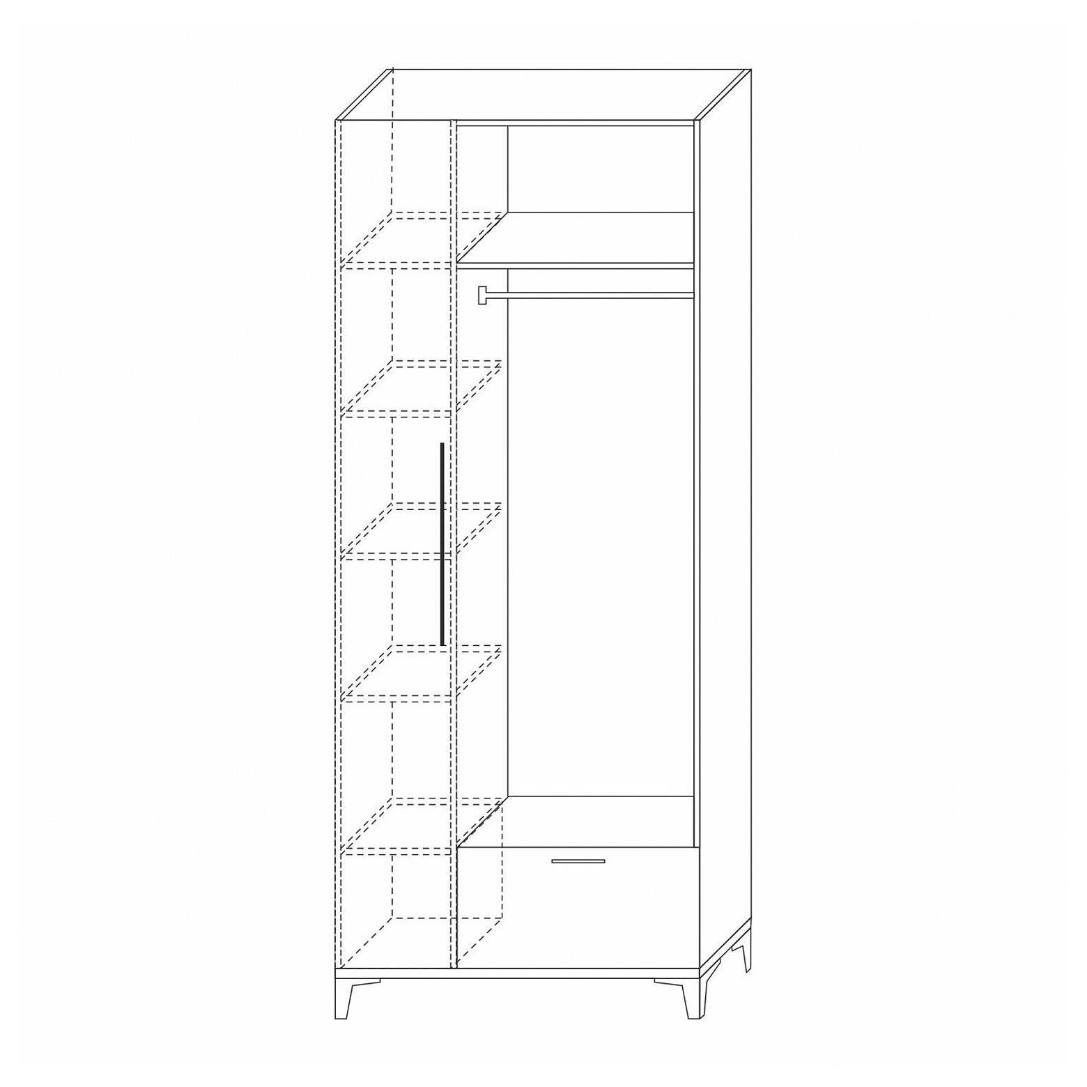 Шкаф платяной Милан универсален для спальни и гостиной. Его конструкция включает бельевое отделение с полками и отсек для хранения одежды в вертикальном положении на штанге. Если не использовать узкий фасад, который входит в комплект, то получится удобный шкаф - стеллаж. Широкий фасад в комплект изделия не входит, приобретается отдельно. Подходящие фасады - артикулы KRZ_SP-1423-401-001 и RZ_SP-1423-402-001.