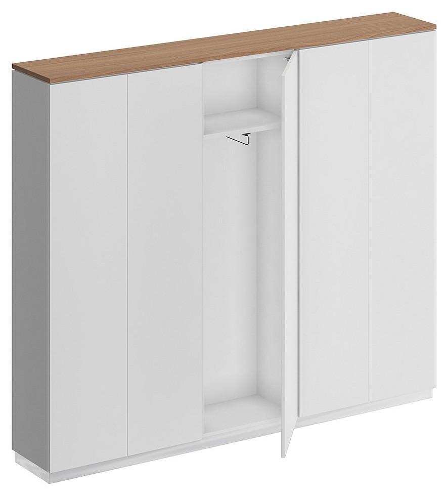 Дизайнерским решением является зазор 8 мм между топом и боковыми стенками корпусом шкафа. Проемы между полками обеспечивают размещение стандартных папок CORONA высотой 320 мм. Шкаф для одежды укомплектован фиксированной по высоте полкой под головные уборы и выдвижной штангой для одежды. Конструктив шкафа для одежды позволяет установить дверь в левом/правом положении. Изделие укомплектовано пятью дверями из ЛДСП без замка с системой открывания Push To Open (без ручек).