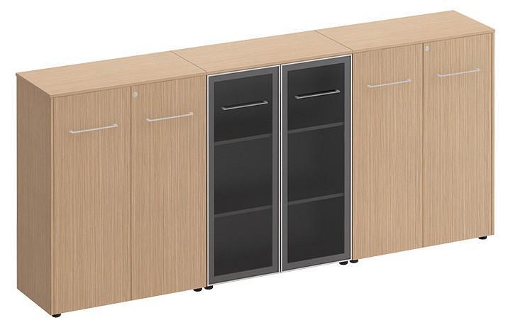 Тумба-витрина состоит из шкафа со стеклом для документов и двух закрытых шкафов для документов под общим топом.