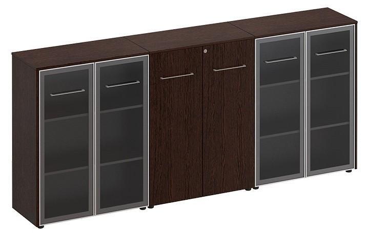 Тумба-витрина состоит из двух шкафов со стеклом и закрытого шкафа для документов под общим топом.